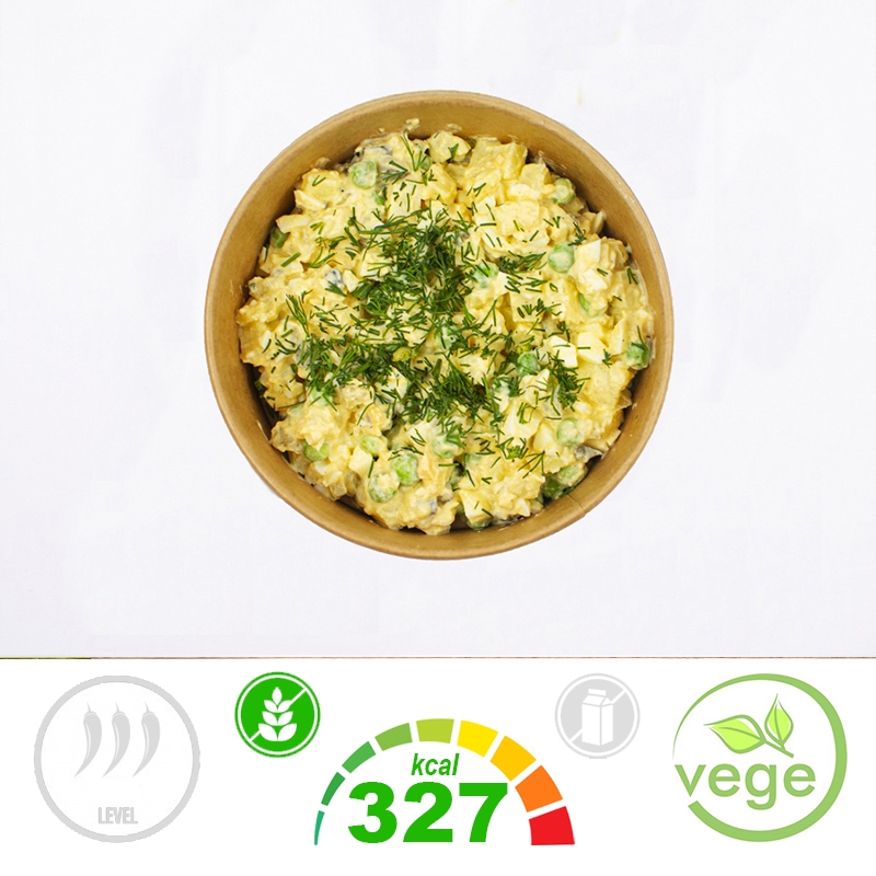 Składniki: Ziemniaki (43%), JAJA KURZE Gotowane i Obrane (Woda, Sól, Regulatory Kwasowości: Kwas Cytrynowy, Kwas Octowy, Kwas Mlekowy) (19%), Ogórki Kiszone (Ogórki, Woda, Sól, Przyprawy W Tym GORCZYCA) (14%), Majonez Domowy (Olej Rzepakowy, Pasteryzowane Żółtka JAJ, Musztarda (GORCZYCA)), Groszek Zielony (9%), Musztarda (Woda, GORCZYCA, Ocet Spirytusowy, Sól), Cebula Biała, Pieprz Czarny, Sól, Koper (1%) Ogrodowy